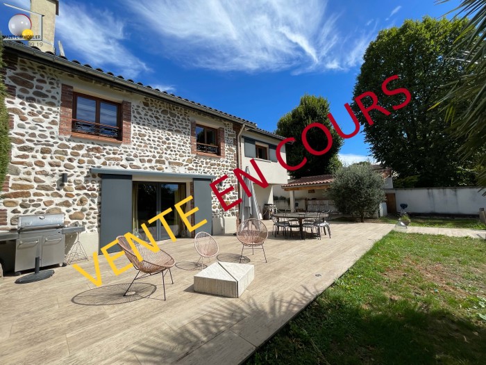 Maison de 174 m2 sur 2 niveaux. Espace de vie 77,36 m2 de plein pied. Coin bureau, buanderie. A l'étage 3/4 chambres, 2 salles de bains. Jardin clos de 961 m2 avec piscine. Grand garage.