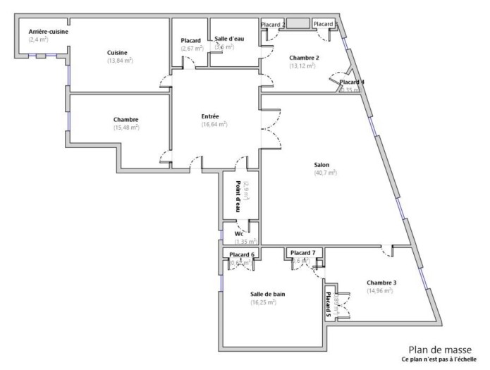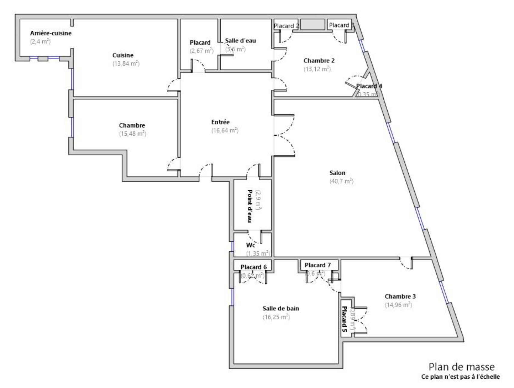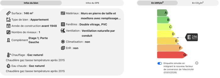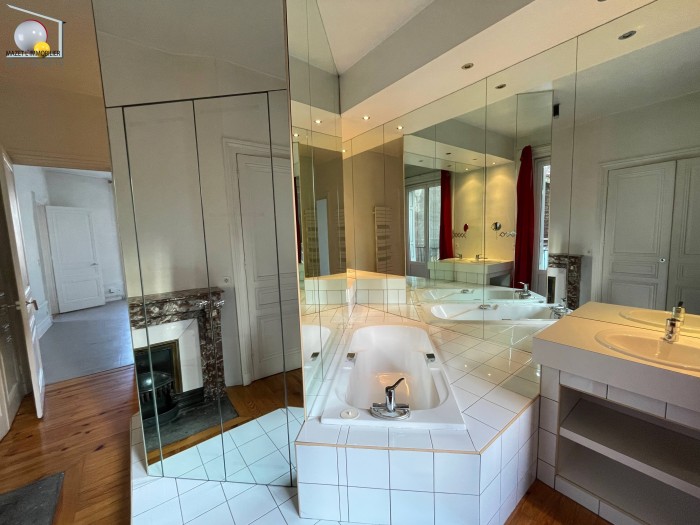 Appartement de 146,37 m2 à rafraichir. Beau séjour de 40,70 m2 avec cheminée. Cuisine de 13, 84 m2. 3 chambres, 2 salles de bains. Cave et grenier.