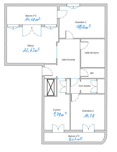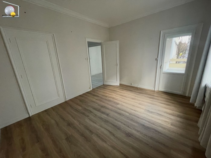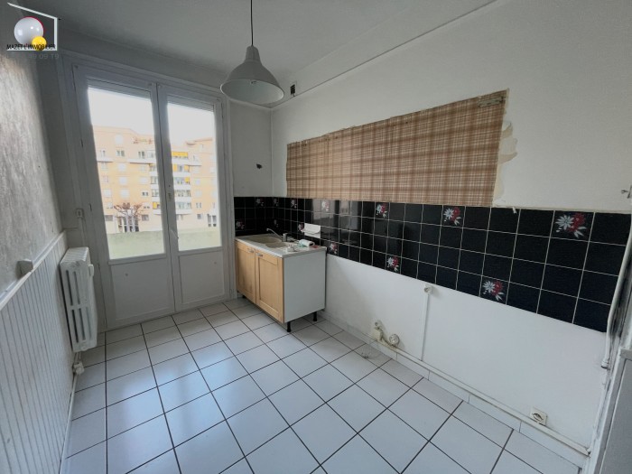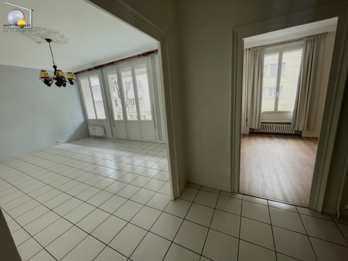 Appartement de 77,68 m2. Séjour de 22,63 m2 ouvrant sur balcon-terrasse de 10,04 m2. Cuisine, 2 chambres, salle de bains. Prévoir travaux.