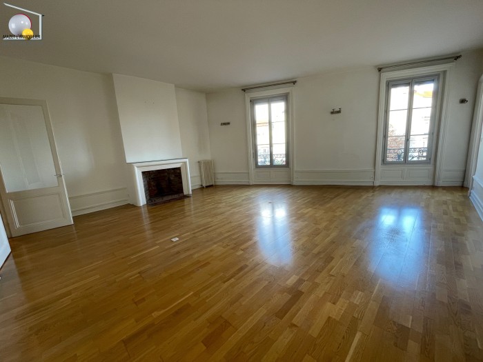 Appartement de 146,37 m2 à rafraichir. Beau séjour de 40,70 m2 avec cheminée. Cuisine de 13, 84 m2. 3 chambres, 2 salles de bains. Cave et grenier.